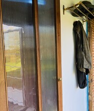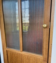 Porte battante vitrée en chêne pour une toilette dans une maison paysanne en Normandie. Les verres en Prismasolar. Le chêne en finition naturelle. La pognée en laiton.