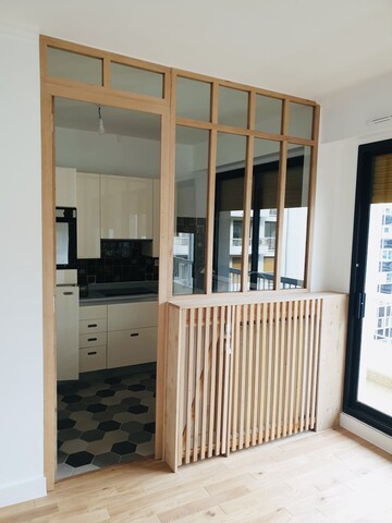Verrière en chêne massif et sa porte battante pour un appartement parisien. Finition chêne naturel claire.